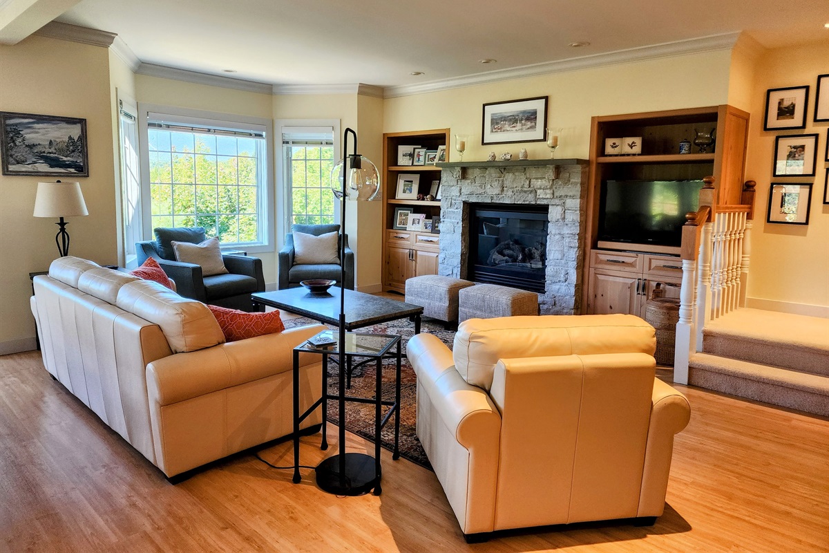 – Open-concept living area with a cozy fireplace and abundant natural light and bay windows offering amazing Mountain Views